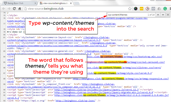 How do we figure out which theme our favorite website is using? Let’s say you love the new Being Boss blog design at beingboss.club  and you are thinking that one could work well for you. The first thing you do is view the source code of that website and if you are not sure how to do this, just Google, “find out website source code” and you’ll find instructions for your particular setup there.